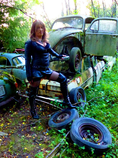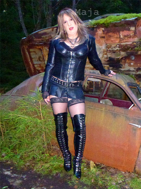 Ein wilder Schrottplatz diente als Kulisse für ein kleines Foto-Shooting im Lederoutfit.