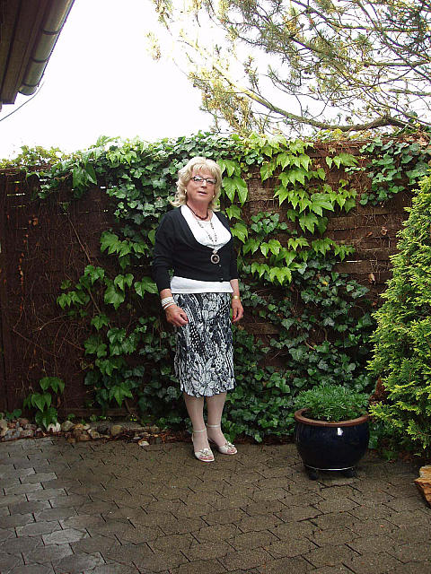 | In einem gemusterten Röckchen und einem mit Straßsteinchen verzierten Oberteil auf meiner Terrasse |